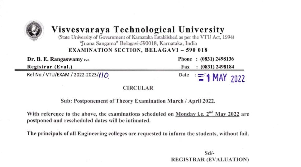 Visvesvaraya Technological University (VTU) via its official circular dated 19th May 2018. The VTU June/July theory exams scheduled on 28th May 2018 have been postponed to 10th June 2018(Sunday) due to the postponed assembly election in Rajarajeshwari assembly constituency, Bengaluru. The timings remain unchanged for the postponed exams.