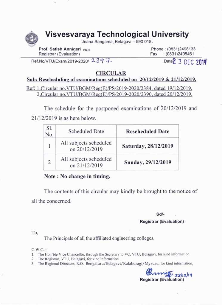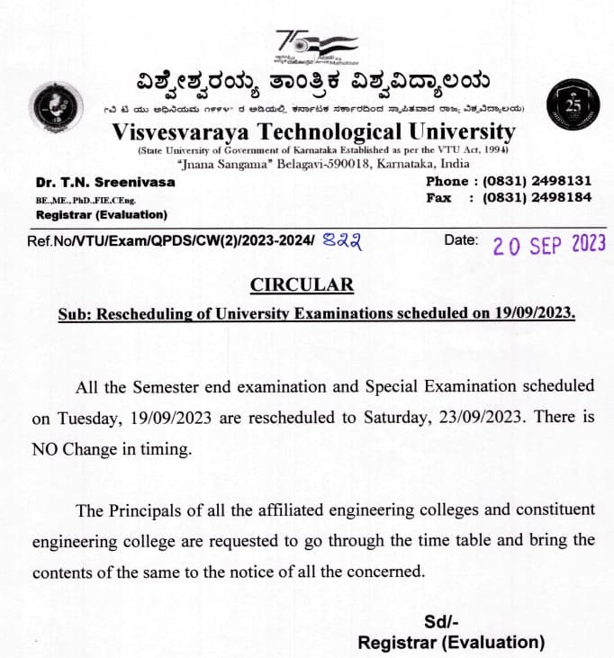 VTU Semester End Exams and Special Exams to be held on 29th Sep 2023 are rescheduled. Below are the details:
