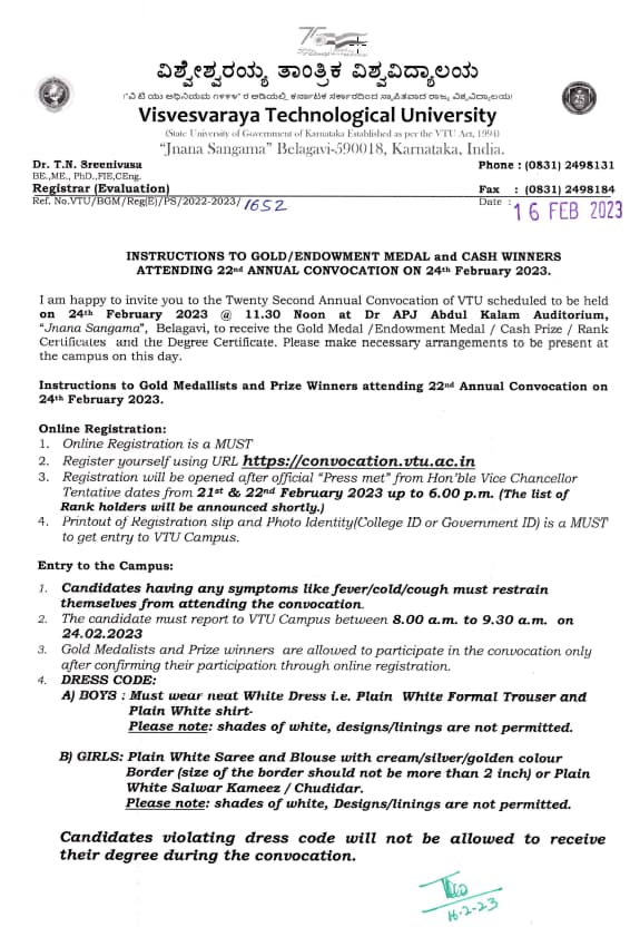 VTU announces the date and venue of the 23rd Annual Convocation Ceremony that is to be held to award the Gold medalists and Rank Holders of of 2022-23 batch of undergraduate and eligible candidates of PhD degree.